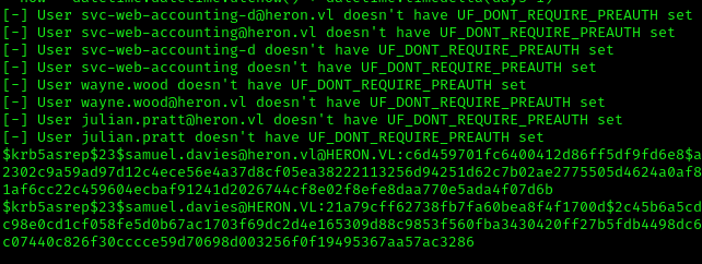 1 | ./kerbrute userenum -d heron.vl --dc 10.10.232.133 ~/Downloads/usernames.txt |